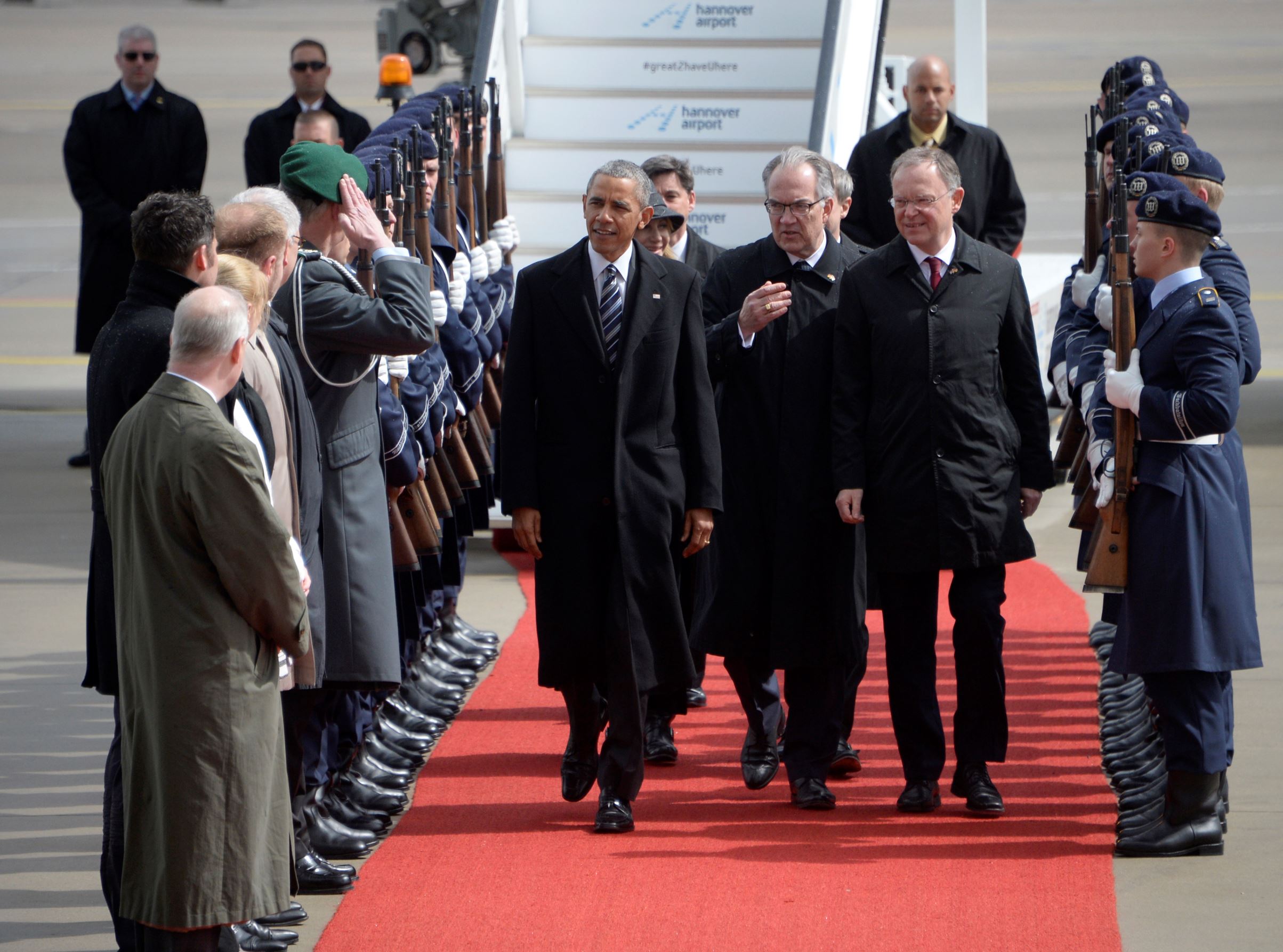 | © REUTERS/Nigel Treblin U.S. President Barack Obama is invited after his landing in Hanover air terminal, Germany April 24, 2016. |